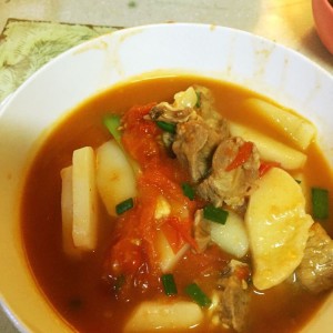 再冷水入锅倒入大概小半锅水,(水不要太多,因为这个不是炖排骨汤,是烧年糕,肉味要浓点好)加入少许料酒姜片和3粒花椒(花椒不用太多,不然都是花椒味)压制。大概烧开滴子转动后转中小火再压制5分钟就可以了