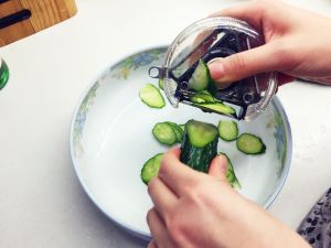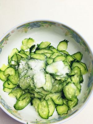撒上食盐,一定要搅拌均匀,腌制20分钟左右,让食盐把黄瓜中的水分腌制出来。