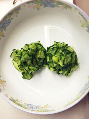 黄瓜腌制完,用白水反复冲洗,冲淡黄瓜的盐份,用手挤出黄瓜中的水。