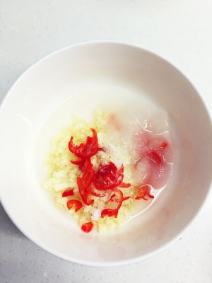 把蒜切成蒜蓉,泰椒去籽切碎,和白醋,白糖,味精混成碗汁,如果怕酸加少许纯净水。