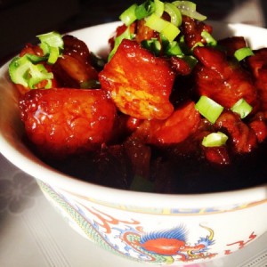 五花肉变色出油即可,盛出备用。锅内的油加入料酒,老抽,冰糖。至冰糖融化后加入炒好的五花肉。