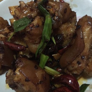 炒锅烧热后加入油,放入老干妈辣酱炒出红油,放入生姜和辣椒,炒香,放入煮好的猪蹄,翻炒。加入糖、椒盐调味,出锅前加入蒜苗翻炒,出锅