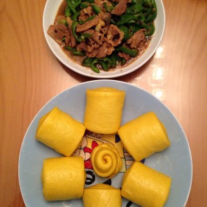 当然配点小菜就更好了,如:青椒炒肉!冬夜里温暖的南瓜馒头!