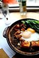 盖上盖,换最小火,再煮五分钟。关火,不要开盖,继续焖十分钟,砂锅散热很慢,里面还很热呢。十分钟后打开锅盖,把青菜放上面,沿着锅边倒一圈酱汁,搅拌一下就可以吃到热气腾腾的煲仔饭啦!酱汁可以用海鲜酱油或者蚝油,我用的是剩下的红烧肉汁儿,非常的香,米饭非常的烫!