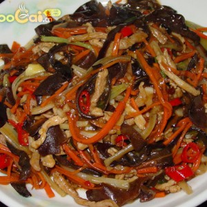 炒锅上旺火,下猪油烧至六成热,下肉丝炒散,加姜、蒜和剁碎的泡红辣椒炒出香味,再加入玉兰片、木耳炒几下,然后烹入芡汁,颠翻几下即成