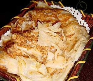 3、起油锅,放入洋葱饼,炸至呈金黄色,排在盘中,两边放些香菜点缀。