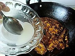 煮至汤汁快干时,加入适量的水淀粉。