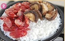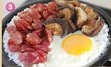 香菇、油菜洗净焯水备用。香菇对半切开,腊肠切片码放在米饭中。