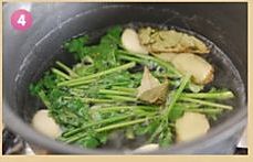 小锅中加入适量清水,水不必多,够一顿饭的用量即可。放入葱姜片、香菜、香叶煮开,转小火熬煮5分钟左右,捞出煮过的料不要留水备用。