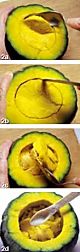 沿瓜肉距瓜皮约2厘米处, 用小刀切一圈,沿分界将瓜肉挖出,再将瓜瓤挖清。将瓜肉放回南瓜内,撒点盐调味