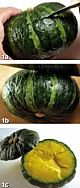 距小南瓜蒂下约2.5厘米处,沿南瓜用小刀刻出浅线一圈,用菜刀沿线斩下,分出瓜盖和瓜身