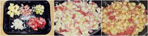 1.土豆、腊肠、火腿肠、葱、洋葱(全部切丁) 2.以上食材全部切丁后,烧锅热炒,最后倒上盐、鸡精、耗油