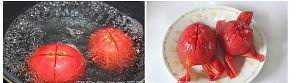 将番茄去蒂洗净,在光滑的那面用刀子打上半厘米深的十字刀花,然后放入沸水中煮20秒关火,将番茄捞出剥去外面的薄皮,然后将去皮后的番茄切成小粒。