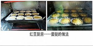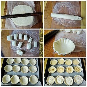 飞饼皮稍化冻,两张相叠上面放上薄膜擀至一下。再卷成长条。切成小块。取一块擀成圆皮放入塔模中按紧。依次全部做好。舀入挞水至8分满,可添加一些香蕉粒,或者喜欢的任何水果。