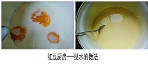 奶液晾凉把蛋黄加入。搅拌均匀成为挞水备用。