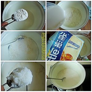 奶锅中加入10克低粉。加入牛奶。搅拌均匀至无颗粒状。加入淡奶油。加入白糖。继续搅拌均匀小火加热至糖化关火。