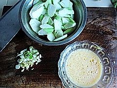 丝瓜去皮切滚刀快,鸡蛋打散,葱姜蒜切碎。