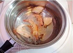 虾、蛤蜊放入锅中微煮一下,捞出备用。将煮过海鲜的汤放置5分钟沉淀以后,将清汤倒入碗中备用。