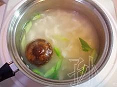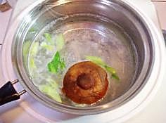 起油锅,爆香葱姜,加老汤,放入香菇。