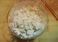 将面粉放入大碗中,逐渐将冷水加入面粉内,水要一点点的加,用筷子搅拌成疙瘩,碗中没有干面即可。