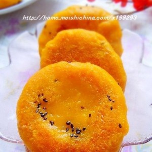 饼铛抹油,油热后,煎南瓜饼两面有火花,金黄就可以了