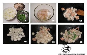 锅中倒入适量食用油,把裹上蛋浆的鲜贝和虾仁放入锅中滑炒至变色。